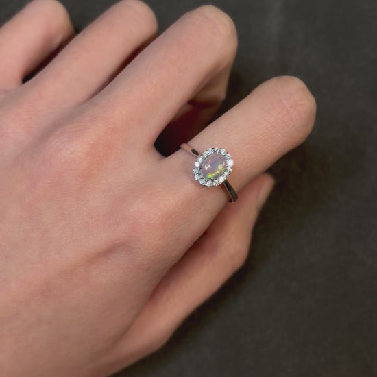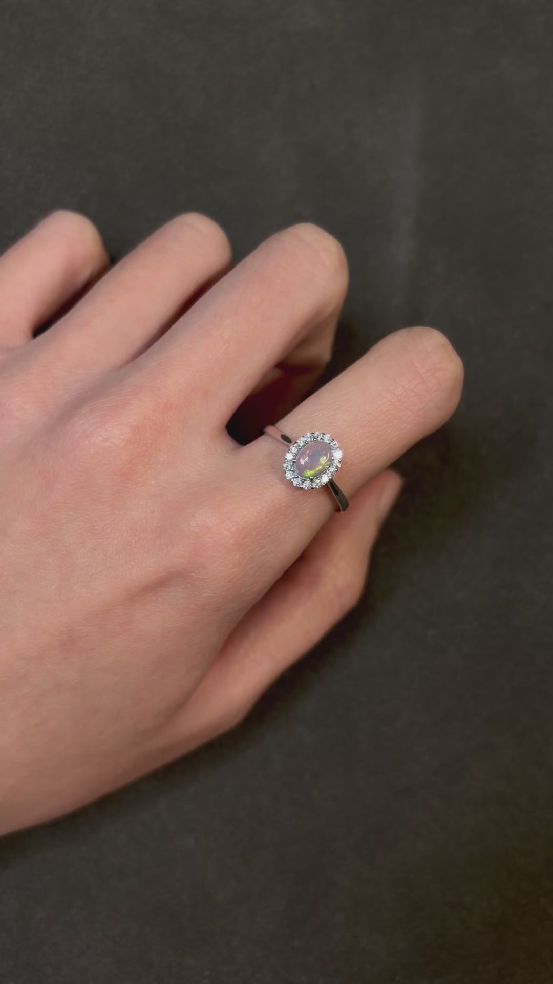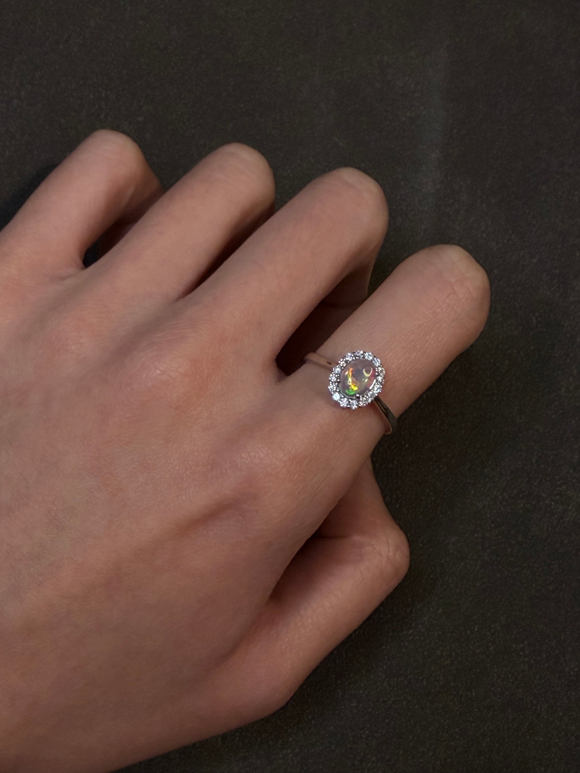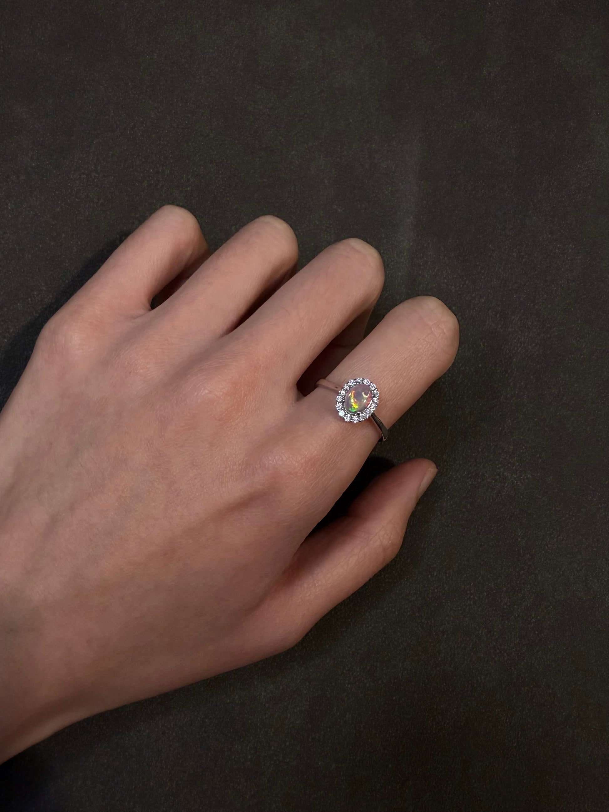 非洲歐泊的火彩如油畫般懸浮在石頭中,因具吸水特性,若碰到水將暫時失去火彩,靜置晾乾即可恢復。平常盡量避開碰到水、香水、化學清潔劑等,以確保歐泊及戒托的閃亮與壽命🫶
